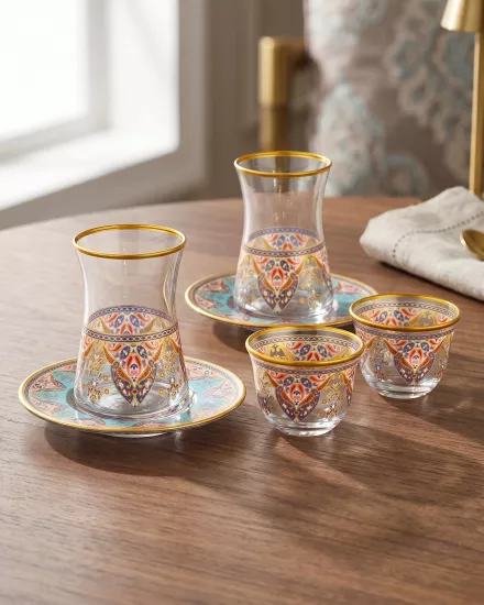 Bu setler 18 parçadan oluşuyor. İçinde 6 adet çay bardağı, 6 adet altlık ve 6 adet mırra fincanı bulunuyor.